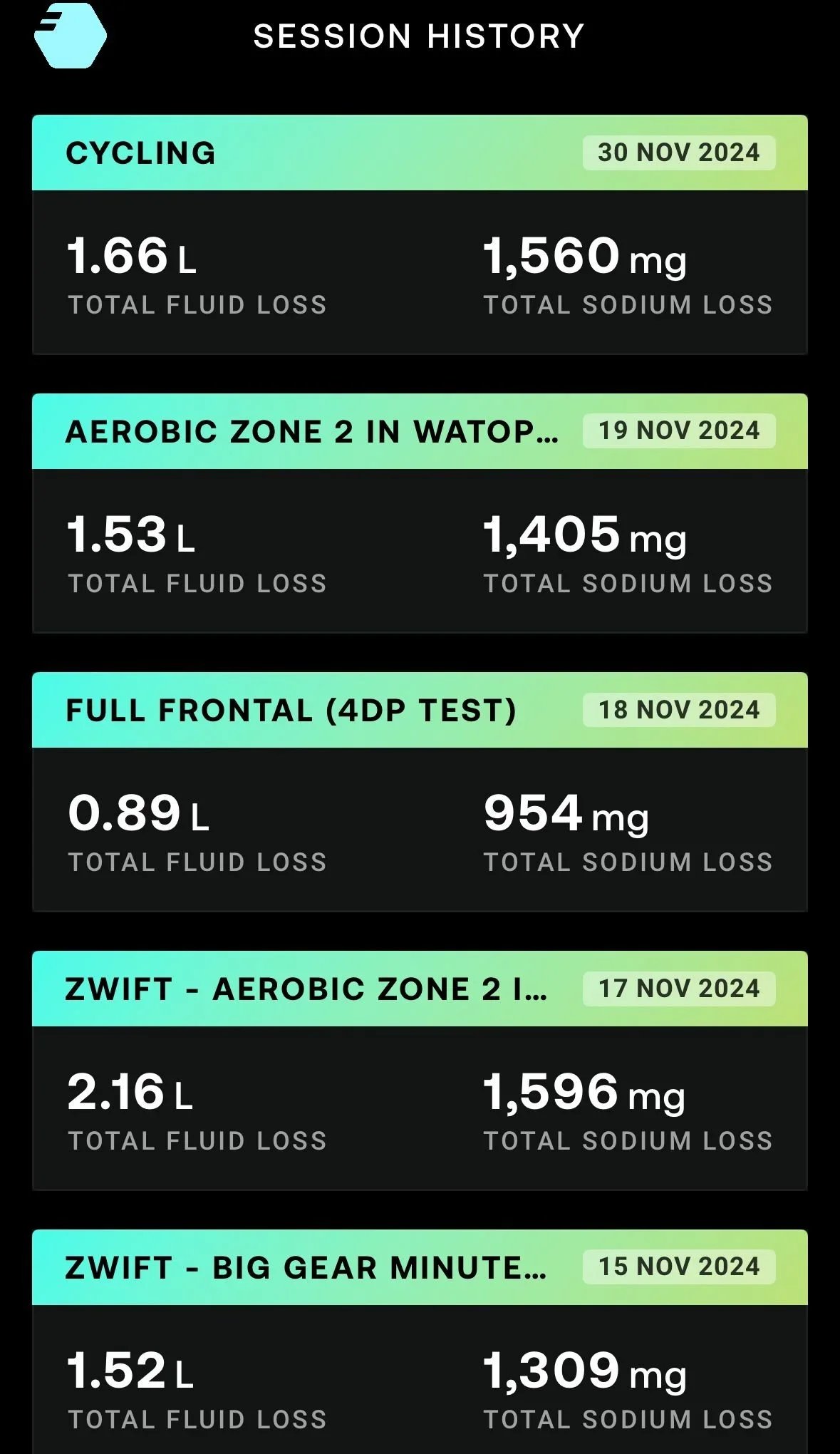 As the screenshot above shows, there was a difference of 642mg of total sodium loss between the highest and lowest in the training data. I must say that these were not performed in a lab environment, but they were all an hour in duration, all in the same location and on the same equipment. The zone 2 ride on the 17th of November was a heated session, which I have been implementing this winter ahead of some 2025 goals, leading to more sweat and a higher sodium loss. This however is not a reason to ignore the result, as this is part of my training, and it shows that we must be aware of what we are doing and what we are replenishing or losing in our sweat.